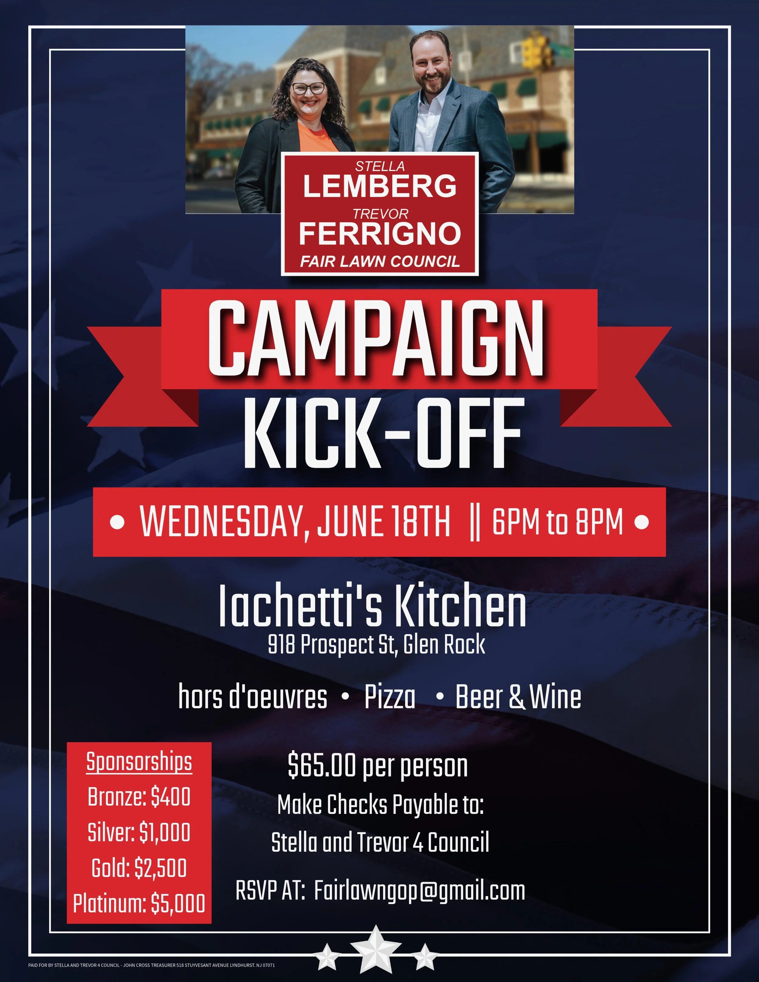 Campaign Kick Off Party! Wednesday, June 18, 2025 6:00 PM 8:00 PM Google Calendar ICS Come kick of this campaign season with your Republican Council Candidates, Stella Lemberg & Trevor Ferrigno. Bring your a friend and let’s get excited to win back two seats in November! Hosted by our friends at Iachetti’s Kitchen in Glen Rock, NJ.